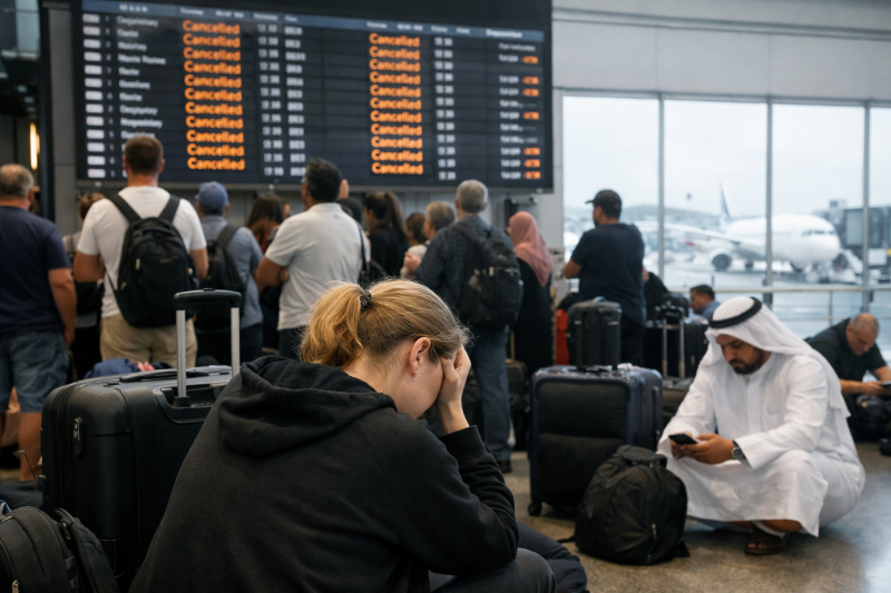 Reports indicate that hundreds of thousands of travellers were affected as airlines cancelled flights connecting the Middle East with Europe, Asia, and North America.